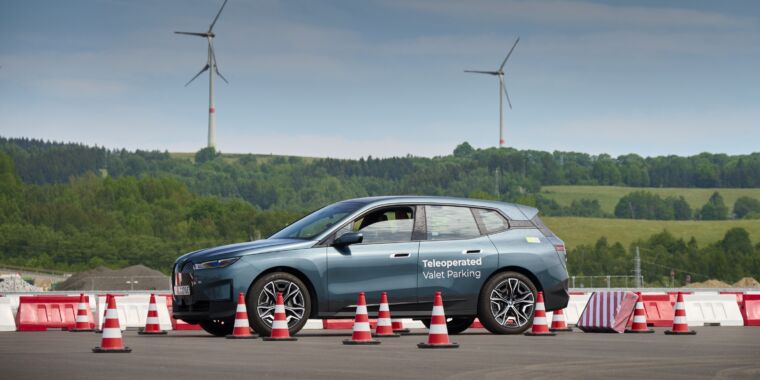 Enlarge / Neither of these test BMWs has a human in the driver's seat. (credit: BMW) BMW provided a…BMW’s valet parking test trades red vests for remote driving rigs
